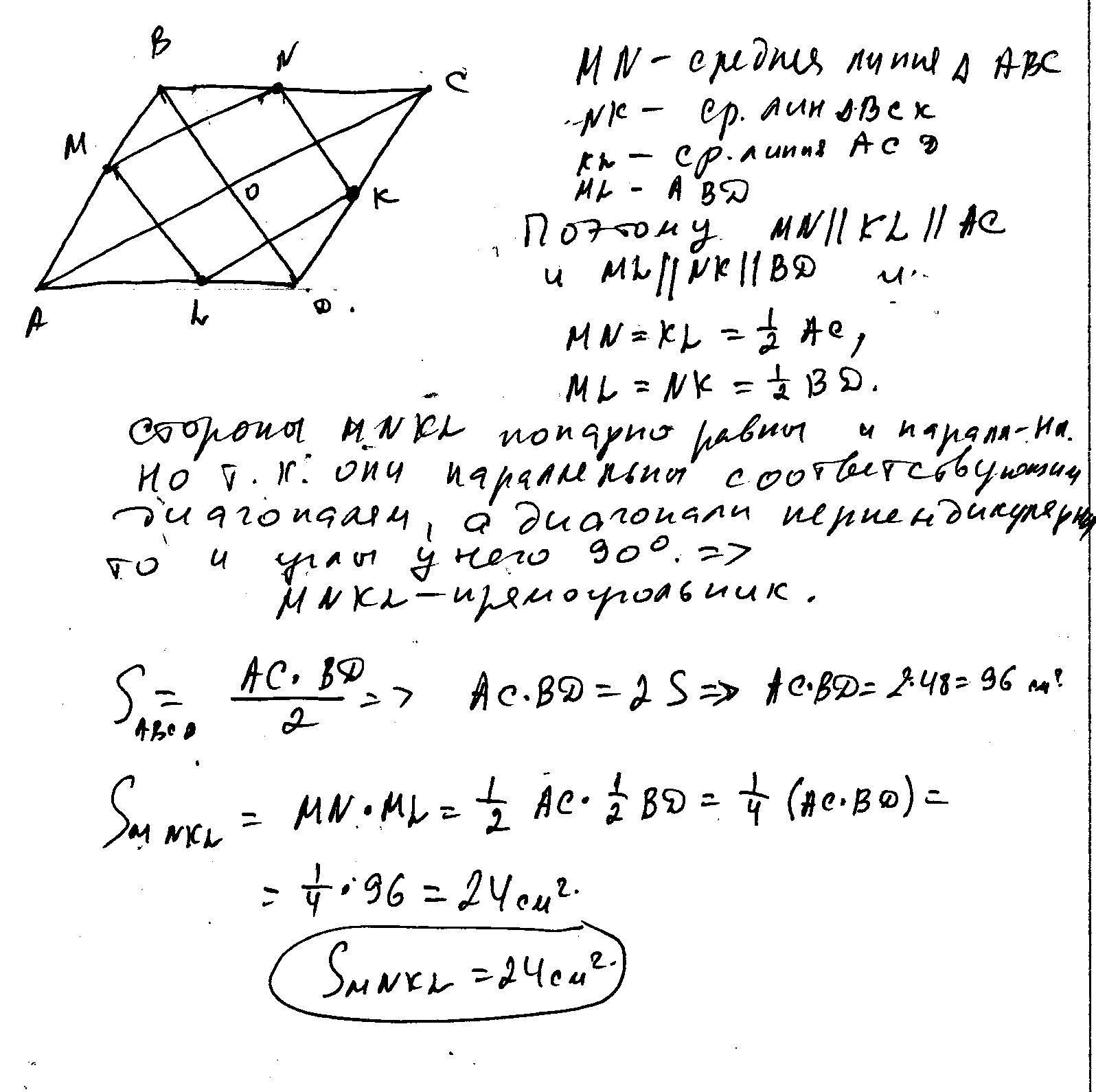 площадь ромба равна 48 см2. Найдите площадь четырёхугольника вершинами которого являются середины сторон данного ромба