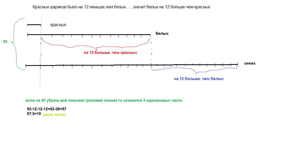 красных на 12 меньше, чем белых, значит белых больше, то есть меньше всего белых. Белых какая то часть. Красных на 12 больше, то есть к части белых мы прибавляем 12 таких же частей...а синих еще больше чем белых, теперь прибавляем еще 12 таких же частей.......
