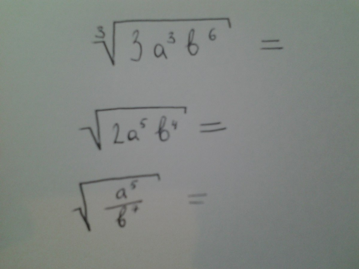 1) ![sqrt[3]{3a^3b^6}= sqrt[3]{3} * a^{frac{3}{3}} * b^{frac{6}{3}}= sqrt[3]{3}ab^2 sqrt[3]{3a^3b^6}= sqrt[3]{3} * a^{frac{3}{3}} * b^{frac{6}{3}}= sqrt[3]{3}ab^2](https://tex.z-dn.net/?f=+sqrt%5B3%5D%7B3a%5E3b%5E6%7D%3D+sqrt%5B3%5D%7B3%7D+%2A+a%5E%7Bfrac%7B3%7D%7B3%7D%7D+%2A+b%5E%7Bfrac%7B6%7D%7B3%7D%7D%3D++sqrt%5B3%5D%7B3%7Dab%5E2)