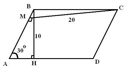 ΔABH - прямоугольный, т. к. ВН - высота. По свойству прямоугольного треугольника (Если один из острых углов прямоугольного треугольника равен 30°, то сторона, лежащая против этого угла равна половине гипотенузы) сторона ВА = ВН * 2 = 10 * 2 = 20 см. Высота известна СМ = 20 см, найдем площадь: S = АВ * СМ = 20 * 20 = 400 см²