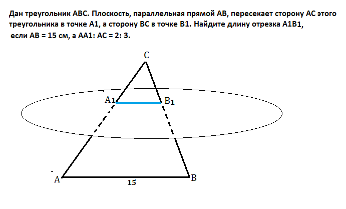Дано трикутник ABC. Площина, паралельна прямій AB, перетинає сторону AC цього трикутника в точці A1, а сторону BC в точці B1. Знайдіть довжину відрізка A1B1,якщо AB=15 см, а AA1:AC=2:3.