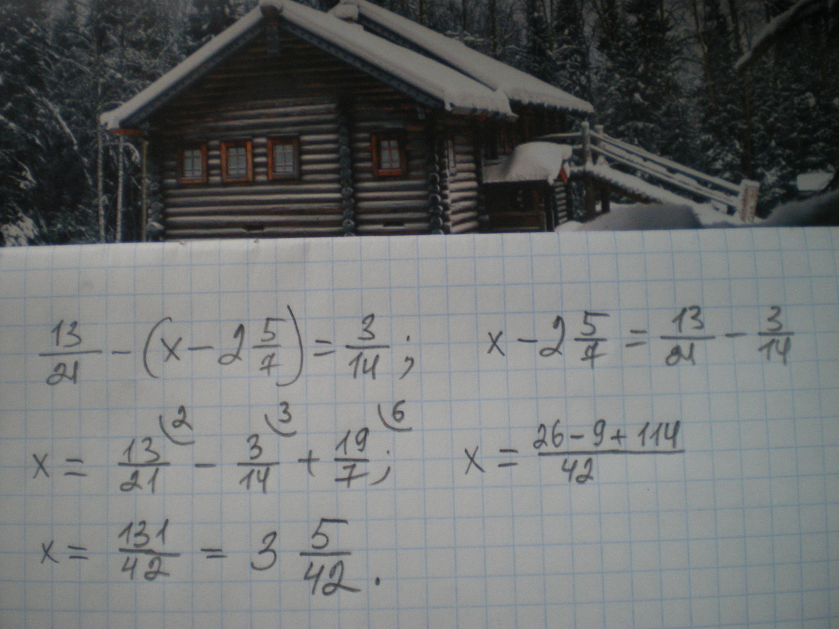 13/21 - (x-2 5/7)= 3/14, 13/21 - x + 19/7 = 3/14, 3 - 21x + 57 = 9/2 = 4,5, 21x = 60 - 4,5 = 55,5 x = 55,5/21 = 2,64