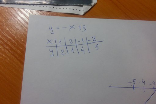 Для начала как показано на рисунке чертим не большую таблицу, там будут значения х и у, берем рандомные числа и подставляем их туда.Дальше рисуем оси х и у как опять же показано на рисунке. Для того чтобы определить какими будут х и у мы выбираем сначала число обозначающее х и подставляем его в уравнение тем самым решая его, если число с минусом, минус на минус дает плюс и число меняет свой знак.