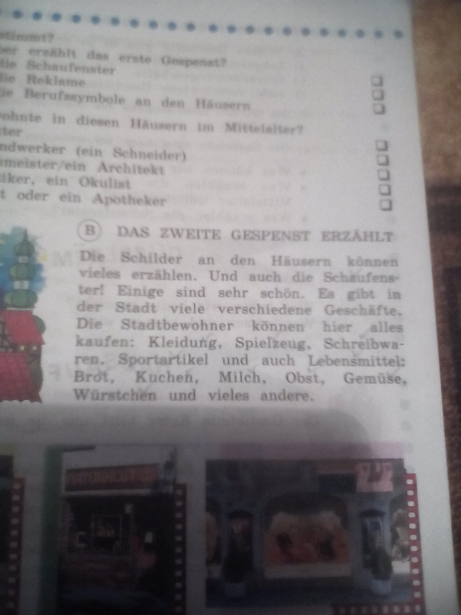Вывески на домах могут рассказать многое. А также витрины! Некоторые из них очень красивы. В городе есть много различных магазинов. Городские жители могут тут всё купить: одежду,игрушки,канцтовары. Спорттовары а также продукты: хлеб,пирожки,молоко,фрукты,овощи,колбасу и многое другое.