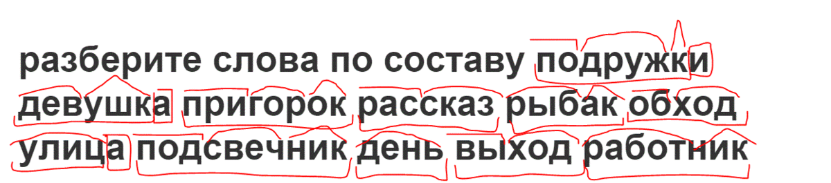 разберите слова по составу подружки девушка пригорок рассказ рыбак обход улица подсвечник день выход работник