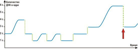 Перед вами – график изменения количества ДНК в ядре клетки с течением времени.