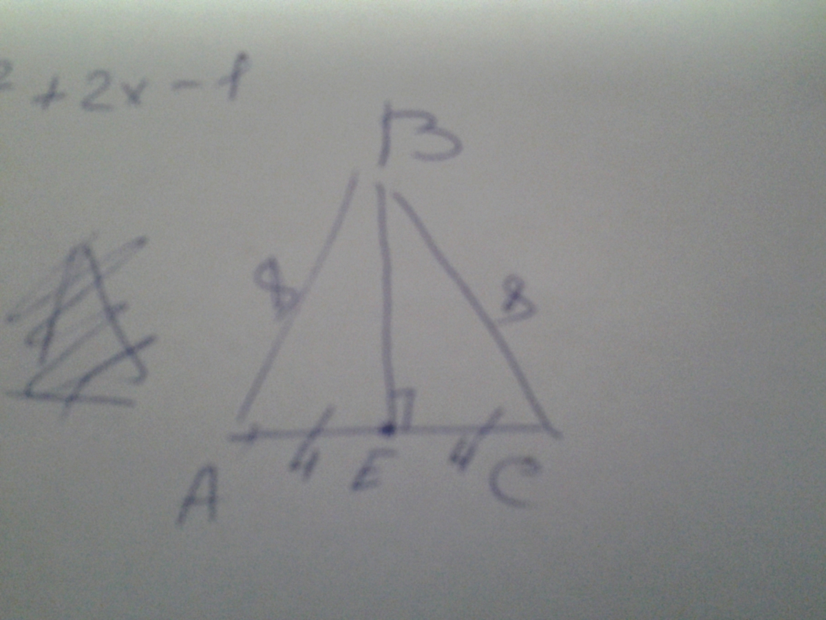 АВ2=АЕ2+ВЕ2, ВЕ2=АВ2-АЕ2, ВС2=ВЕ2+ЕС2, ВС2=АВ2-АЕ2+ЕС2=8×8-4×4+4×4, ВС=8