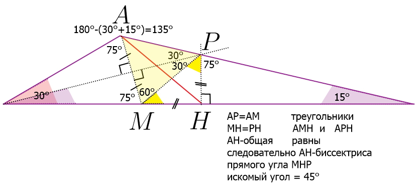 Углы, прилежащие к одной из сторон треугольника, равны 15° и 30°. Какой угол образует с этой стороной приведённая к ней медиана. Если можно то ответ объясните по подробнее