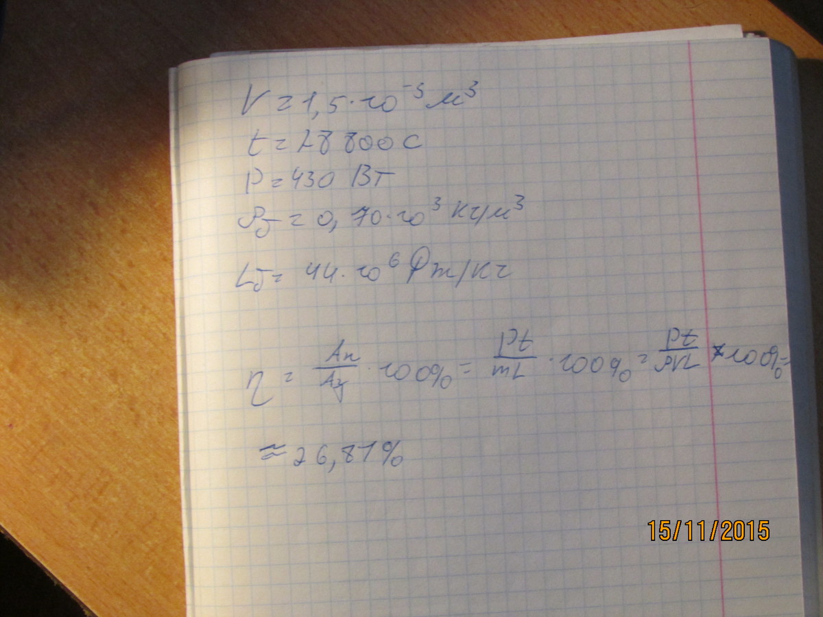 Определите КПД двигателя внутреннего сгорания мощностью 430 вт , если он за 8 ч работы расходует бензин объемом 1,5 л