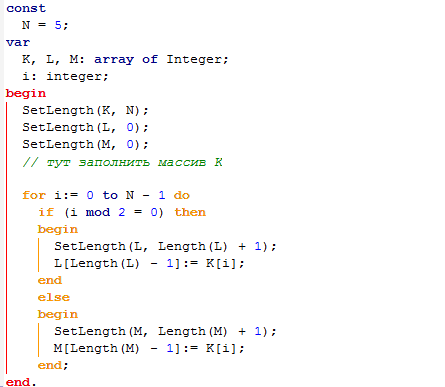 Задан одномерный массив K[n]. Создать одномерные массивы L и M. Массив L будет содержать четные элементы массива K, а массив M - нечетные.
