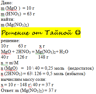 10г оксида магния обработали раствором содержащим 63 г азотной кислоты какая масса соли при этом образовалась при этом?