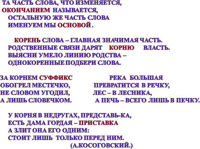 Та часть слова, что изменяется окончанием называется, Остальную же часть слова именуем мы основа. Корень слова - главная,значимая часть. Родственные связи дарят корню связь.
