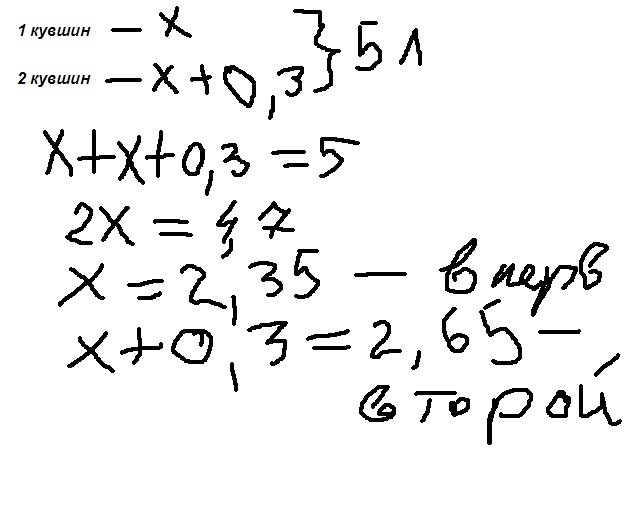 в двух кувшинах 5л сока. В первом на 0.3 л меньше,чем во втором. Сколько литров сока в каждом кувшине?