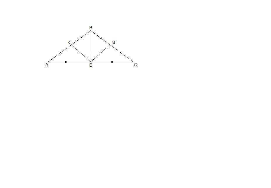 в равнобедренном треугольнике ABC , точки К и М являются серединами боковых сторон АВ и ВС соответственно. BD - медиана треугольника. Докажите , что треугольники АКD = СMD