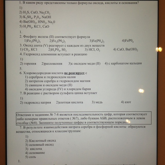 1)4; 2)2(Fe3(PO4)2, если быть точной. Плохо вижу индексы); 3)4; 4)2: 5)вопрос пропущен в тесте; 6)без понятия. Реакция идет везде, но некоторые в жестких условиях, а что от тебя требует программа - не знаю, извини. 7)2; 7(после рамки с объяснением))3 и 5; 8) А - 1, Б - 3, В - 4; 9)Вещество х - CaO;
