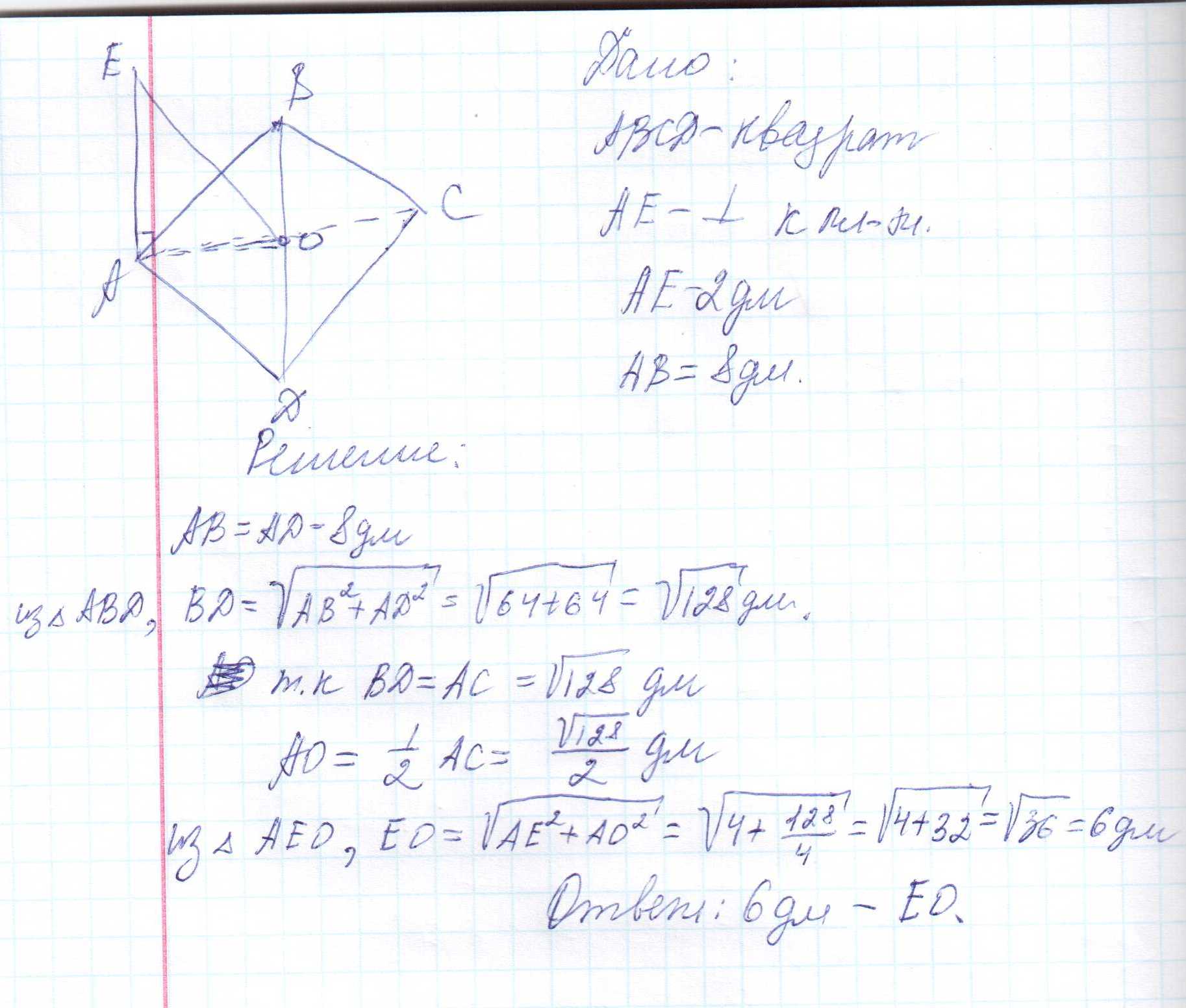 Из вершины квадрата АВСД восстановлен перпендекуляр АЕ к плоскости квадрата.Чему равно расстояние от точки Е до прямой ВД,если АЕ=2 дм,АВ= 8 дм?