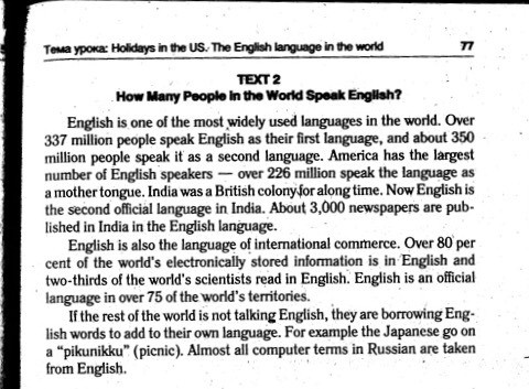 Англ. один из самых широко используемых языков в мире. Свыше 337 миллионов людей говорят на английском, как на их первом языке, и около 359 миллион говорят на нем, как на втором. В америке наибольшее число англоговорящих людей - около 226 миллионов говорят на нем как на родном языке. Индия была Британской колонией долгое время. Сейчас Англ. второй официальный язык в Индии Около 3000 газет публикуются в Индии на англ. языке. Англ. также язык международной торговли.Около 80% всего мира хранит информацию в электронном мире на английском языке и две трети ученых мира читают на англ. Англ официальный язык на 75% территории мира