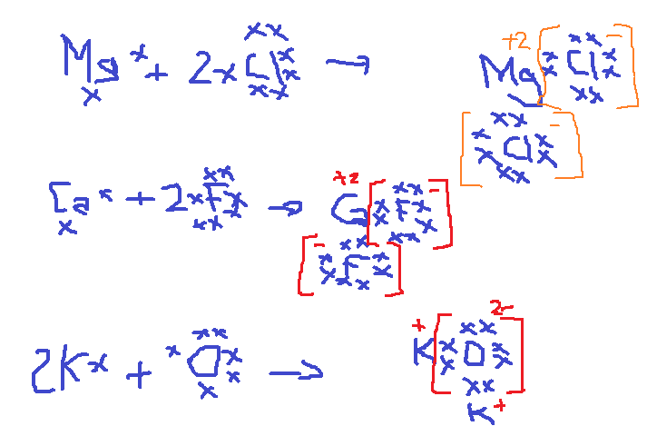 1) Рассмотрите схемы образования ионной связи между атомами химических элементов: MgF, KO, CaF2