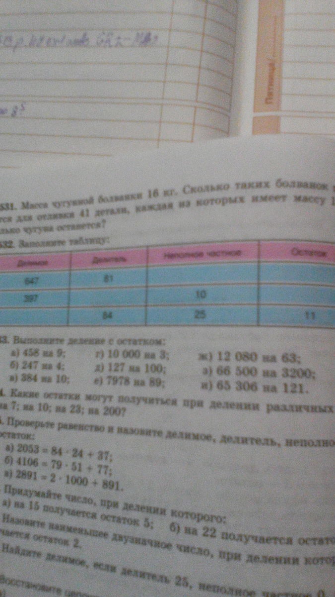 Заполните таблицу. 1) Делимое 647 делитель 81 неполное частное ? остаток ? 2)делимое 397 делитель ? неполное частное 10 остаток ? 3) Делимое ? делитель 84 неполное частное 25 остаток 11 ПОМОГИТЕ ПОЖАЛУЙСТА!!!