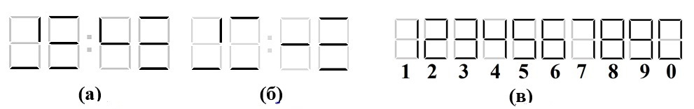 Имеются сломанные электронные часы (они идут точно, но некоторые элементы табло перегорели). Показания часов в некоторый момент времени приведены на рисунке (a), а спустя ровно 23 минуты – на рисунке (б). Определите время, которое на рисунке (а) показывали бы исправные часы. Отображение цифр на исправном табло показано на рисунке (в). В ответе укажите через двоеточие часы и минуты. Например, если часы показывали 12:04, то в ответе необходимо указать 12:04.