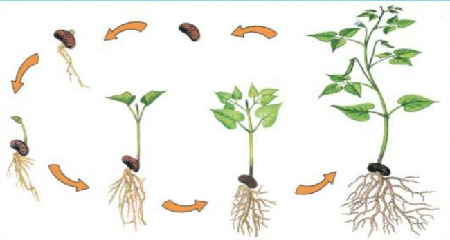 Семя - проросток с корешком - зеленый росток с листочками - взрослое растение с цветами - взрослое растение с плодами и семенами