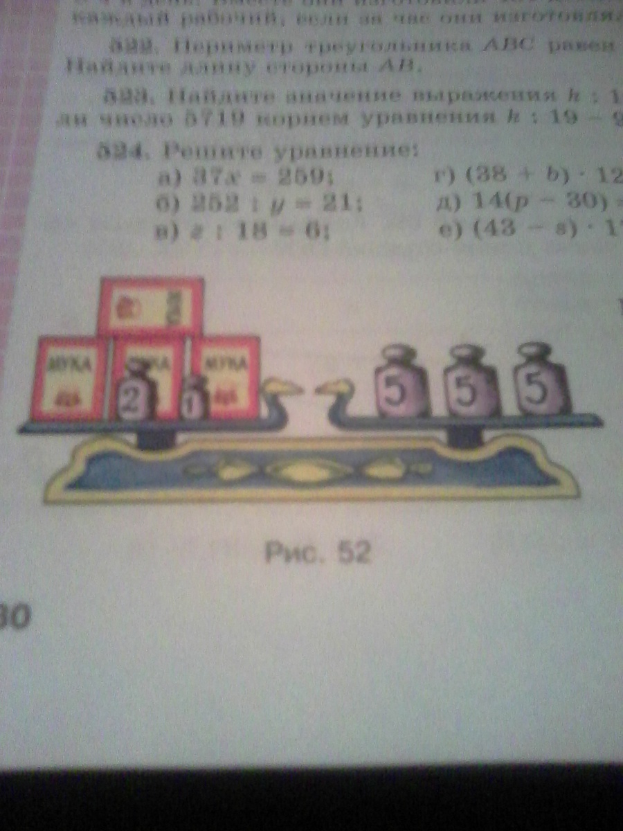Составьте уравнение по рисунку 52 (гирь дана в килограммах) и найдите массу каждого пакета