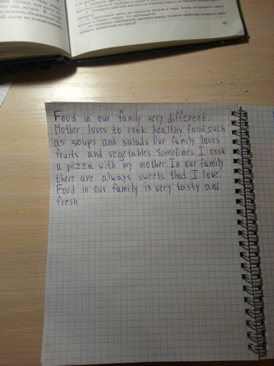 Помогите пожалуйста! По английскому языку задали написать сочинение на тему " Еда в нашей семье". Я английский знаю плохо, сама написать не смогу. Помогите пожалуйста, буду очень благодарна.