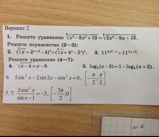 6)Элементарное уравнение, так что не буду расписывать как решать, но напишу идею: Представить sin2x как 2sinx cosx, потом поделить обе части на cos^2(x), заменить везде sinx/cosx через tgx, потом сделать замену tgx=t, решить квадратное уравнение, получить корни этого квадратного уравннение, а потом поочередное приравнять tgx этим корням.