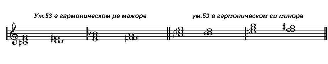 Уменьшенное трезвучие в строится в мажоре на VII ступени, в миноре на II ступени. В гармоническом мажоре добавляется ум.53 на II ступени, в гармоническом миноре - на VII ступени. Разрешается ум.53 движением голосов в терцию с удвоением нижнего тона. Смотрите рисунок.