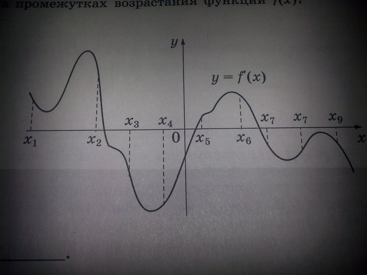 На рисунке изображён график у = f’(x)-производной функции f(x).На оси абсцисс отмечены девять точек : x1, x2, x3, …,x9.Сколько из этих точек лежит на промежутках возрастания функции f(x)?
