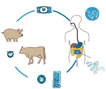 Червь рождается,червь попадает в животное,человек ест плохо прожаренное животное,человек получает бычьего цепня