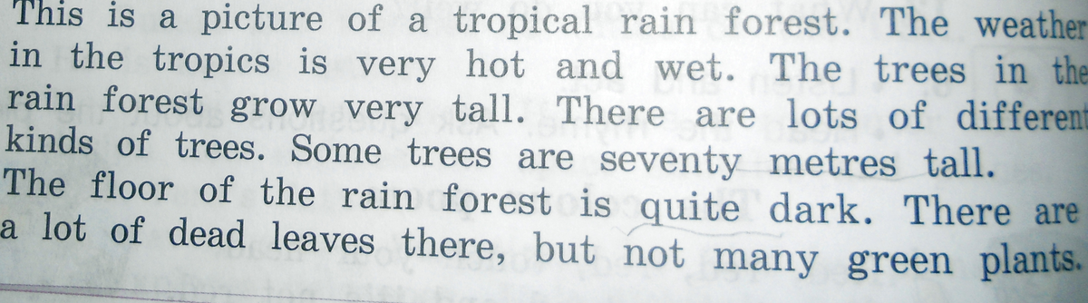Это картина тропического леса. Погода в тропиках очень жаркая и сырая. Деревья в лесу вырастают очень высокими. Есть разные виды деревьев. Некоторые деревья семьдесят метров высотой. Почва (земля) леса очень тёмная. Есть много опавших листьев там, зелёных растений не много.