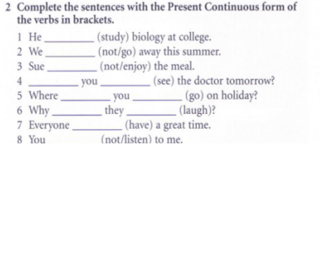 1. Is studying. 2. Aren't going.3.is not enjoying.4. Are you seeing 5. Are you going? 6. Are they laughing?? 7.is having 8. Aren' t listening
