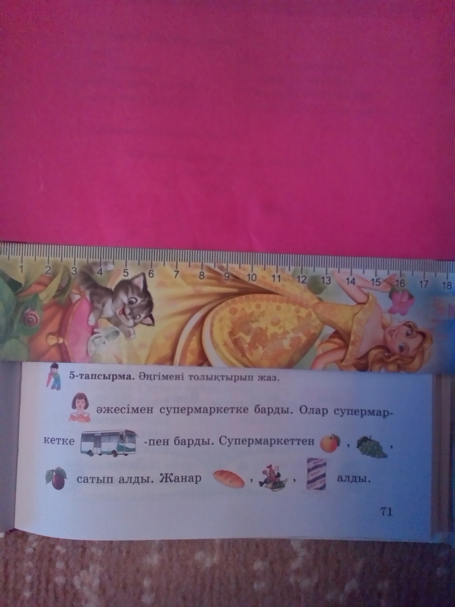 Мен әжесімен супермаркетке барды. Олар супермаркетке автобуспен барды. Супермаркеттен алма, жүзім, _______ алды. Жанар нан,________, ________ алды.