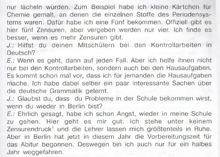 Э: Честно говоря,я боюсь снова возвращаться в свою школу. Здесь у меня всё хорошо,с оценками никто не давит,и учителя по большей части не беспокоят. Но в Берлине в этом году начинаются подготовительные занятия к экзамену. Потому я уехала всего лишь на полгода.