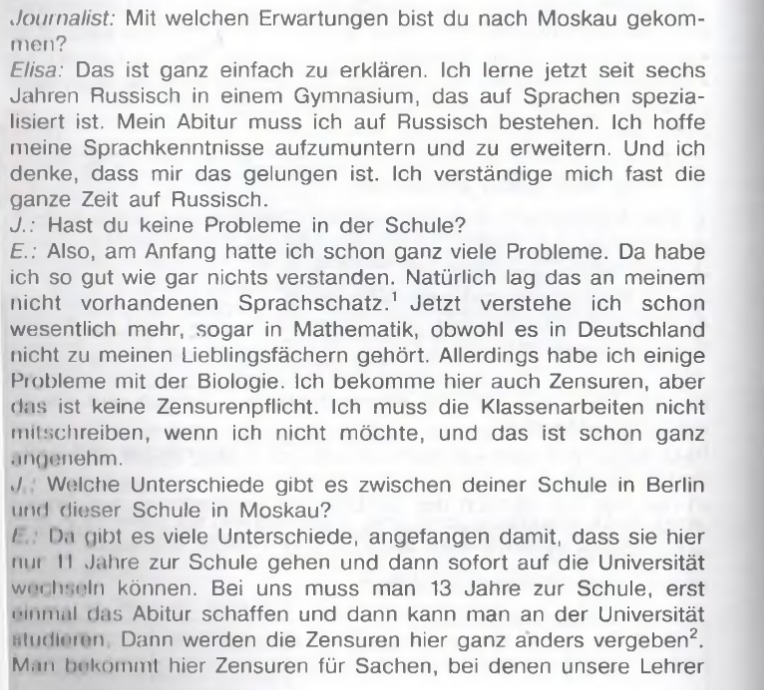 Elisa: Das ist ganz einfach zu erklaren. Ich lerne jetzt seit sechs Jahren Russisch in einem Gymnasium, das auf Sprachen spezia - lisiert ist. Mein Abitur muss ich auf Russisch bestehen. Ich hoffe meine Sprachkenntnisse aufzumuntern und zu erweitern. Und ich denke, dass mir das gelungen ist. Ich verstandige mich fast die ganze Zeit auf Russisch