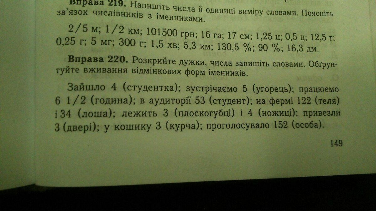 Зайшло чотири студентки; зустрічаємо п*ятьох угорців; працюємо шість з половиною годин; в аудиторії п*ятдесят три студенти; на фермі сто двадцять два теляти і тридцять чотири лошати; лежить троє плоскогубців і четверо ножиць; привезли троє дверей; у кошику троє курчат; проголосувало сто п*ятдесят дві особи.