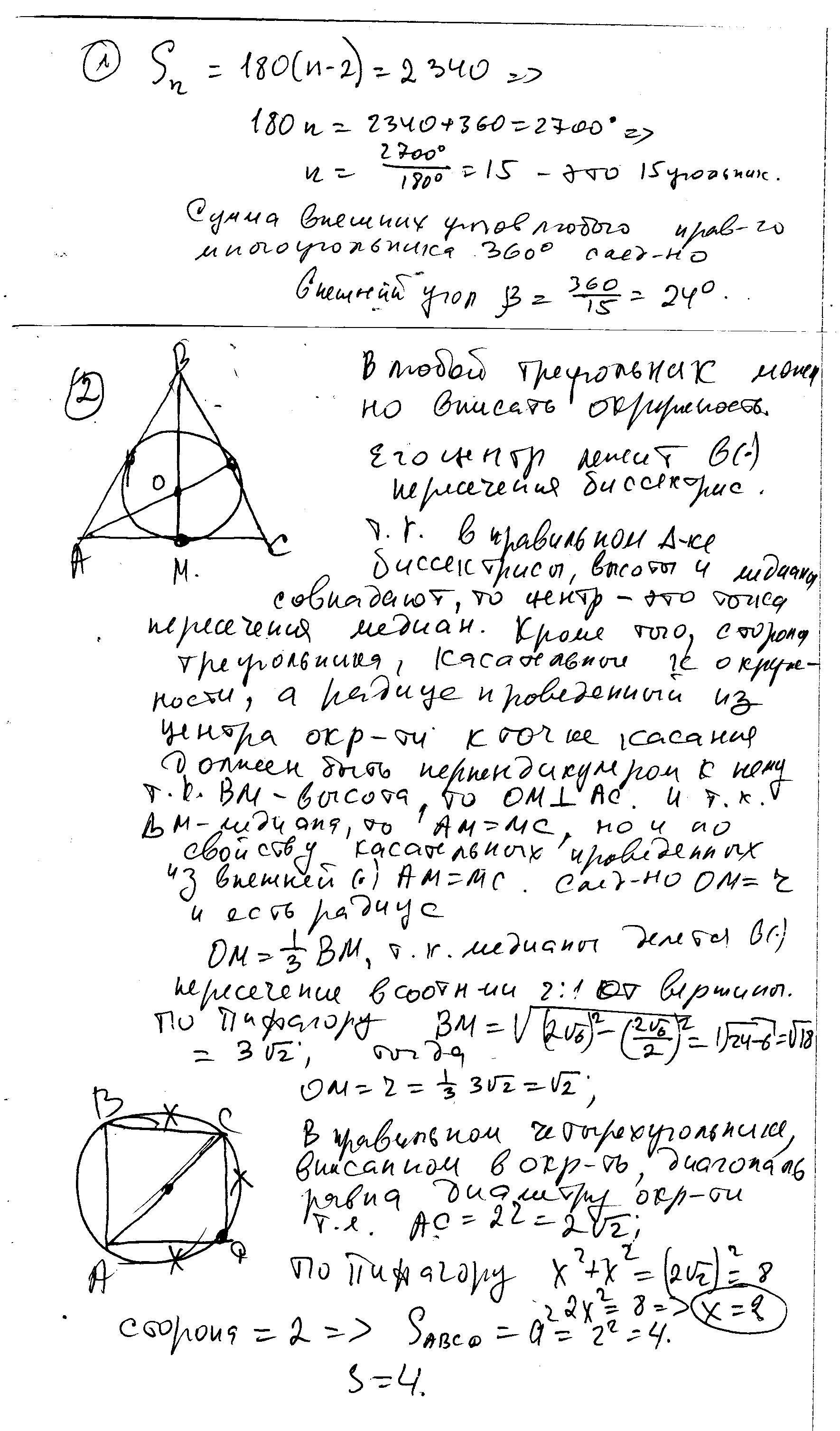1)сумма углов правильного n-угольника равна 2340.Найдите его внешние углы