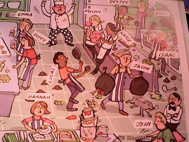 всемирно известный ресторан был зарезервирован для очень важного события, в ресторане шла активная подготовка.Шеф-повар был очень занят. Когда он вернулся на кухню, он увидел, что кухня была в ужасном состоянии. Эмма и Поппи ели пироженные приготовленные для посетителей, Лукас и Исаак играли в теннис сковородками, Кейт и Мэган читали журнал,а Джош гладил на кухне пиджак официанта. И только Декстер и Ханна, как самые ответственные раьотники занимались делом. Декстер готовил, а Ханна мыла посуду.