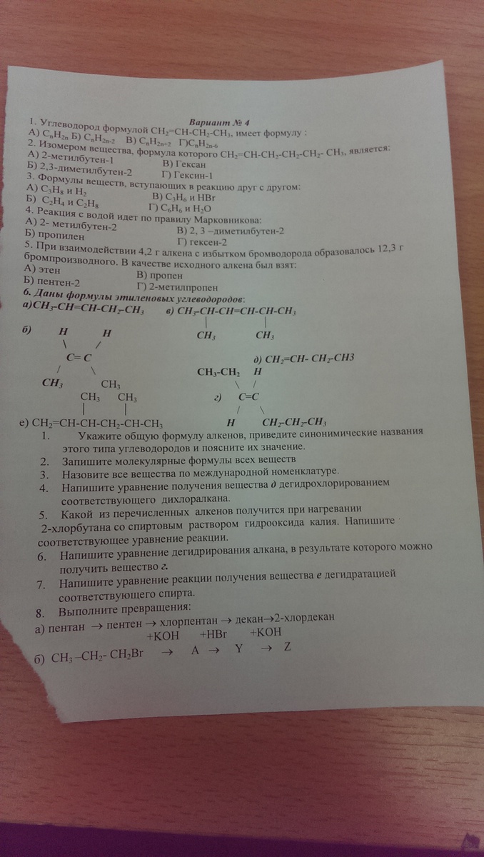 1. - А) ; 2. - Б) ; 3. - В) ; 4. - А) ; 5. - В) ; 6. 6.1. Формула: CnH2n ; Синонимичное название: олефины,этиленовые углеводороды. Этиленовые т.к. простейший представитель этилен-С2Н4. Насчет олефины из-за проведенной реакции в 18 веке этилена с хлором получили продукт этилдихлорид. Представляло оно собой маслянистое жидкое вещество. Назвали его ,,маслородным газом''. Латинское название gass olefiant,отсюда олефины как таковые. 2. Молекулярные формулы. а) C5H10 ; б) C4H8 ; в) C8H16 ; г) C7H14 ; д) C4H8. е) С8Н16. 3. Названия. а) пентен-2 ; б) цис-бутен-2 ; в) 2,5-диметилгексен-3 ; г) транс-гептен-3 ; д) бутен-1. е) 3,5-диметилгексен-1. Остальное файлы. В 6.7. Если надо , то исходный спирт- 3,5-диметилгексанол-1.