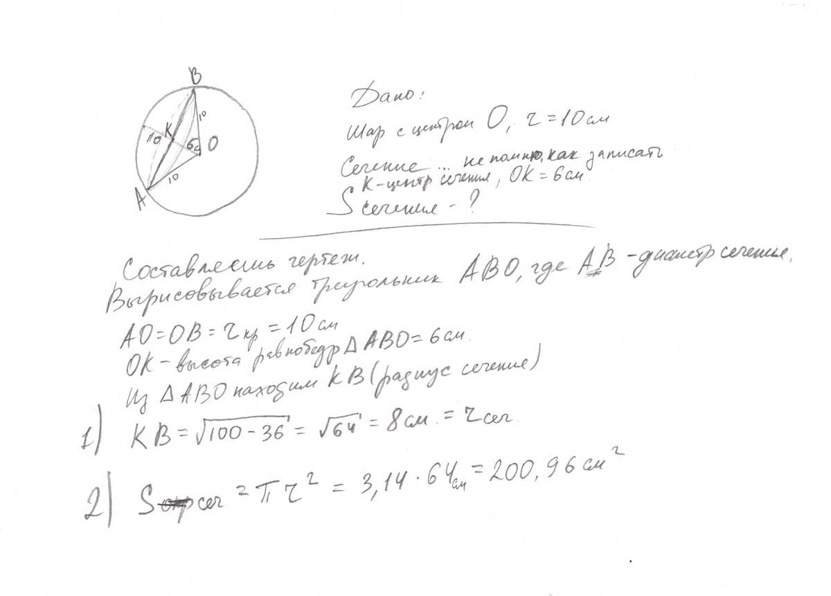В шаре, на расстоянии 6 см от центра, проведено сечение. Найти площадь этого сечения, если радиус шара равен 10 см.