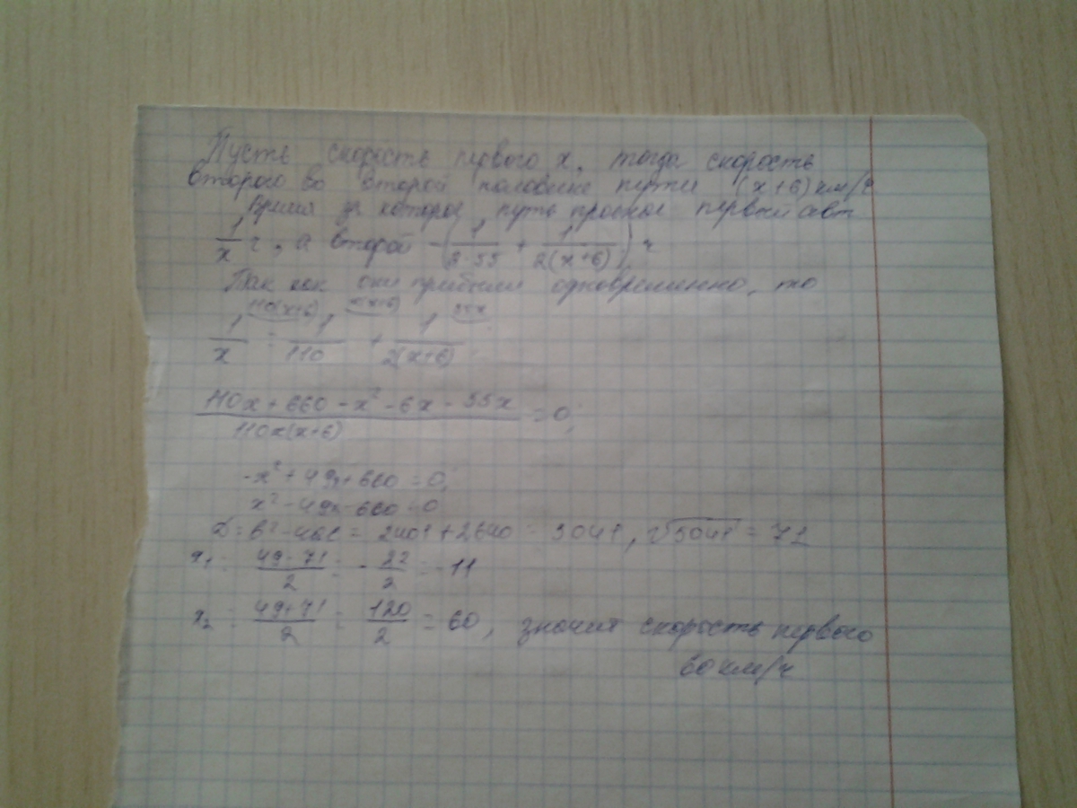 Из А в В одновременно выехали два автомобилиста. Первый проехал с постоянной скоростью весь путь. Второй проехал первую половину пути со скоростью 55 км/ч, а вторую половину пути проехал со скоростью на 6 км/ч больше скорости первого, в результате чего прибыл в В одновременно с первым автомобилистом. Найдите скорость первого автомобилиста.