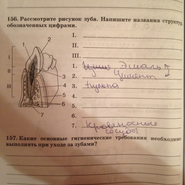 1 - эмаль 2 - дентин 3 - пульпа 4 - цемент 5 - альвеола 6 - кров. сосуды 7 - нервы ( или наоброт 7 и 6)