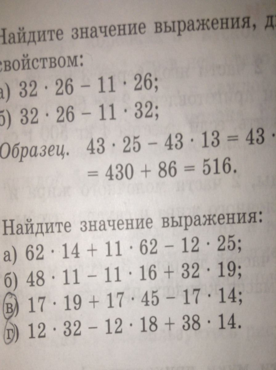 Найдите значение выражения в)17*19+17*45-17*14 г)12*32-12*18+38*14
