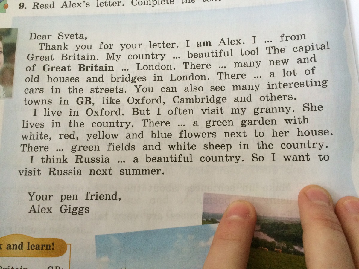 Спасибо за твоё письмо. Я Алекс. Я из Британии. Моя страна очень красивая тоже! Сталица Британии это Лондон. Очень много новых домов. Очень много машин на улицах города. И ещё ты можешь увидеть... Я живу в Оксворде. Но я часто посещаю бабушку. она живёт в деревне. Здесь зелёный сад с белыми,красными, жёлтыми и голубыми цветами рядом с домом. В деревне есть белые овцы. Я думаю Россия красивая страна. Чтож я хочу посетить её на следуещее лето.