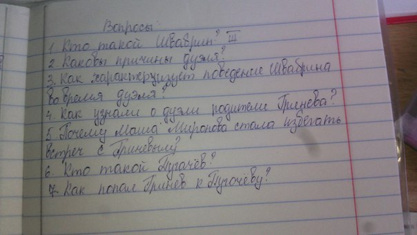 1 и 2 и 3 и 4. Алексей Швабрин в этом произведение антипод Гринева. Он дворянин.Очень некрасив. Переведен в крепость после дуэли, на которой убил человека.Оченьумен. Ухаживал за Машей Мироновой, а после того, как она не ответила взаимностью стал распускать про нее плохие слухи. Это говорит о нем как об отрицательном герое, подлом, мсчительным, злопамятным. Гринев стал защищать честь любимой Маши. Была дуэль. Во время дуэли Швабрин нанес удар в спину Гриневу, когда тот отвернулся на крик слуги. Это ситуация говорит о том, что Швабрин подлый и нечестный человек. Швабрин тайно доносит родителям Гринева о дуэли. Отец запрещает брак с Машей. 5. Маша отказала Гриневу и стала его избегать потому что была очень рассудительная. Она была строгого воспитания и не представляла брак без согласия родителей. а папа Гринева отказал им в браке. Она очень любила Гринева и не хотела причинять ему боль и ссорить его с отцом. Маша умеет жертвовать. 6. Пугачев был вождем. Возглавлял восстание против дворян. Он одновременно и злобный и умеет прощадь, одновременно и хвастливый и мудрый. Он ведет за собою народ. 7. Пугачев захватил крепость, которую защищал Гринев. Но так получилось, что встретились они еще до этих событий. Поэтому во время захвата Пугачев отнесся к Гриневу хорошо. А Гринев сначала видел в нем злодея, но потом узнал лучше. пугачев спас Машу и позволил ей с Гриневым уехать из крепости.