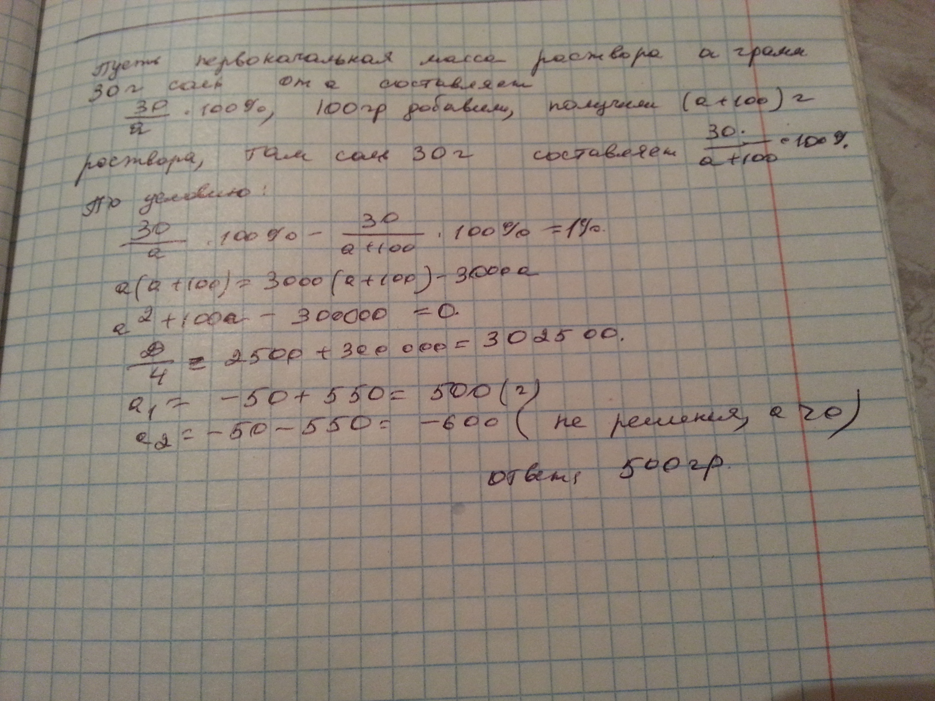 В водный раствор соли добавили 100грамм воды.в результате концентрация соли в растворе понизилась на 1 %.определите первоночальную массу раствора,если известно что в нем содержалось 30 грамм соли.Если можно распишите таблицей и решите уравнение.