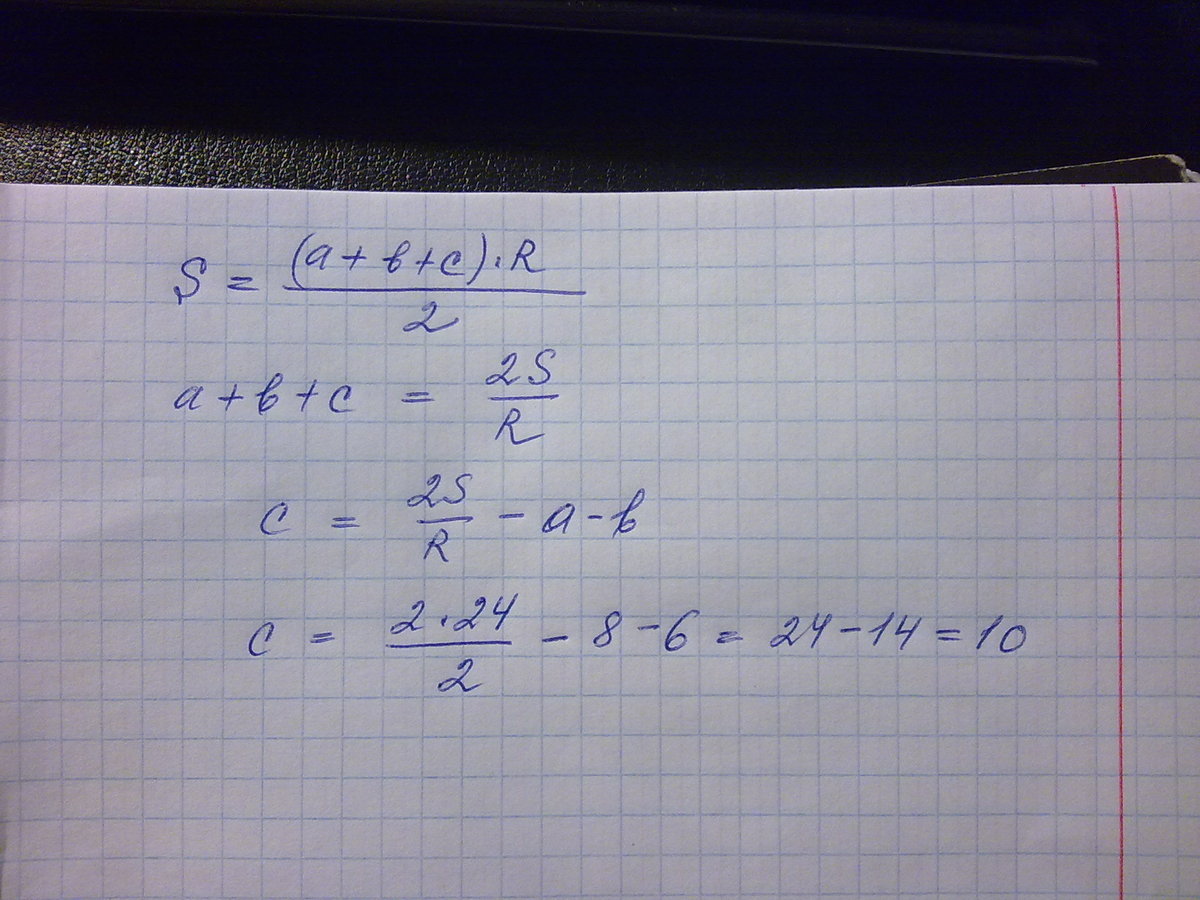 Площадь треугольника можно вычислить по формуле S=(a+b+c)r и поделить на 2 , где a,b,c— длины сторон треугольника, r — радиус вписанной окружности. Вычислите длину стороны с, если S = 24 ,а=8,b=6,r=2