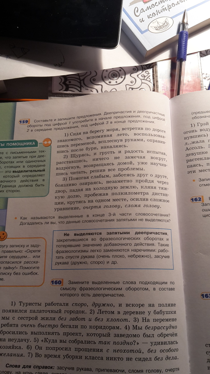 3 Мы занимаемся хорошим делом, помогая слабым. Мы живем,заботясь друг о друге. Старушка шла не спеша, боязливо озираясь. Я вернулся домой, незаметно пройдя через двор. Листья слетали с деревьев, падая на холодную землю. Спортсмен очень устал, пробежав половину дистанции. Девочка танцевала, крутясь на одном месте. Студент решил передохнуть,осилив сложное уравнение. (Ученик несся сломя голову. Я думал все о ней очертя голову)-фразеологизмы