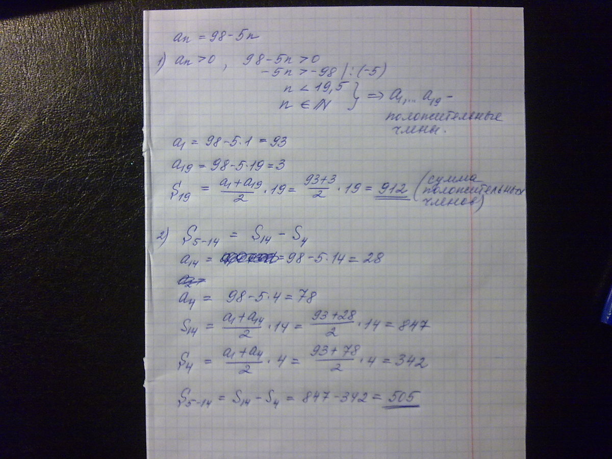 Арифметическая прогрессия задана формулой an=98-5n. Найдите сумму положительных членов данной прогрессии. Найдите сумму членов данной прогрессии с 5-го по 14-ый включительно.